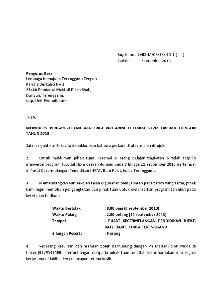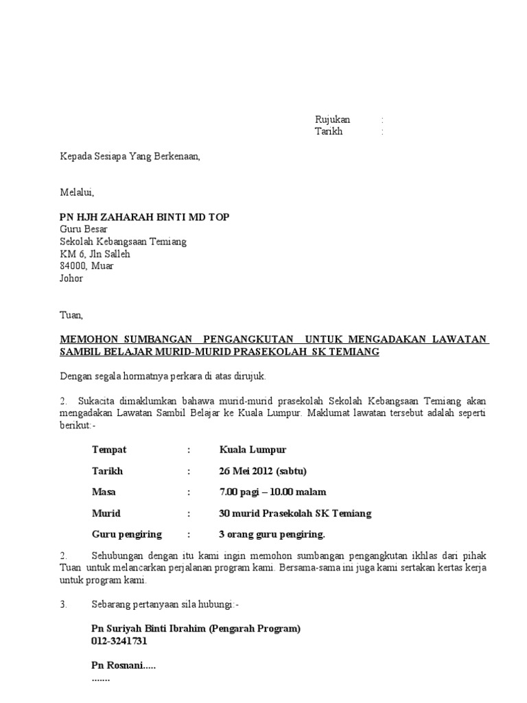 Contoh Surat Permohonan Pengangkutan Bas